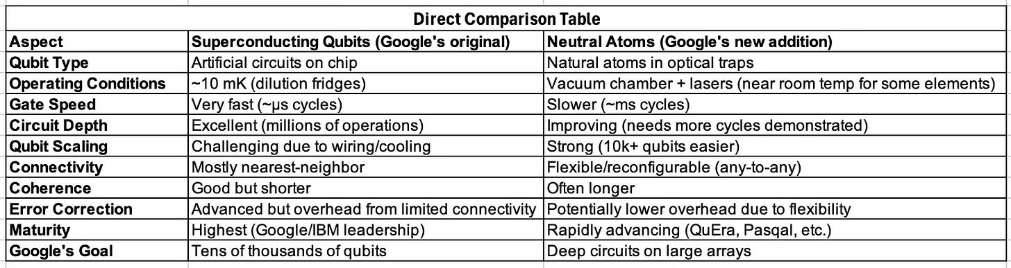 This is not a full replacement but a deliberate dual-track strategy to accelerate progress toward large-scale, error-corrected quantum computers by leveraging the complementary strengths of each approach. Google (via Hartmut Neven) describes it as exploiting the “space-time trade-off”: superconducting systems excel in the timedimension (deep circuits with millions of fast gate cycles), while neutral atoms shine in the space dimension (scaling to thousands of qubits with flexible connectivity).